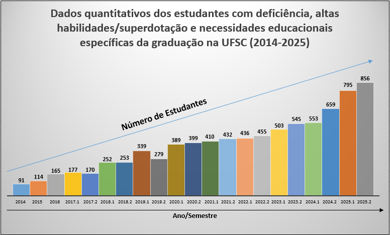 Gráfico de colunas coloridas sobre fundo cinza. No alto, centralizado e em letras pretas, está o título do gráfico: Dados quantitativos dos estudantes com deficiência, altas habilidades/superdotação e necessidades educacionais específicas da graduação na UFSC (2014-2025). Na parte inferior da imagem está uma reta horizontal preta e sobre essa estão 21 colunas, lado a lado, com cores variadas (abaixo de cada coluna está o ano/semestre a que cada uma se refere e sobre cada coluna tem um número – referente ao quantitativo de estudantes). Na coluna mais à esquerda, referente a 2014, está o número 91, de forma subsequente, estão: 2015: 114; 2016: 165; 2017.1: 177; 2017.2: 170; 2018.1: 252; 2018.2: 253; 2019.1: 339; 2019.2: 279; 2020.1: 389; 2020.2: 399; 2021.1: 410; 2021.2: 432; 2022.1: 436; 2022.2: 455; 2023.1: 503; 2023.2: 545, 2024.1: 553, 2024.2: 618, 2025.1: 795 e 2025.2: 856. Abaixo da reta onde estão as colunas está escrito: Ano/semestre. Acima de todas as colunas tem uma reta azul em posição diagonal, que também tem seta para a direita, e sobre essa reta está escrito: Número de estudantes.
